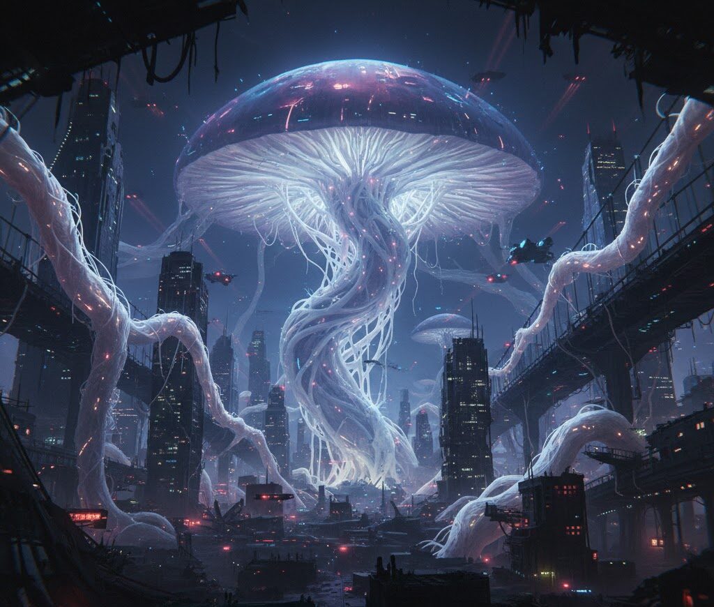 菌類は、単一の生命体でありながら、数キロメートル四方にわたって広がる巨大な情報処理系です。 一箇所の森で起きた異変は、菌糸を通じて瞬時に全土へと共有されます。1億年前から完成されていたその「分散型知性」から見れば、個体ごとにバラバラの脳を持ち、互いに争う人間は、「システムの末端で無意味に火花を散らす、一時的なバグ」に過ぎません。